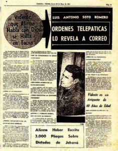 En Febrero de 1977 en el periódico El Comercio obtiene una entrevista como: EL OTRO ENVIADO DE JEHOVA. LUIS SOTO ROMERO CHILENO, ESCRIBE EN UNOS ROLLOS DE PAPEL LO QUE AFIRMA DIOS LE DICTA, dónde da a conocer sus comunicaciones telepáticas; de cómo empezó a escuchar la voz de Jehová y los mensajes que recibía, anunciando que el Divino juicio Final que el Divino Juicio Final esta muy cerca de lo que nos imaginamos; también da a conocer que hasta la fecha el Divino Padre Jehová, le ha dictado alrededor de 4 mil Rollos y que a diario le dictaba de uno a dos Rollos.