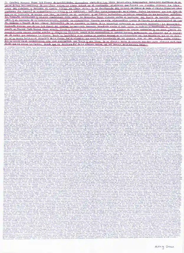 TÍTULO: EL CEREBRO HUMANO POSEE 318 ZONAS DE SENSIBILIDADES, LLAMADAS VIRTUDES; LAS IDEAS GENERADAS, REPRESENTAN IMPULSOS ELÉCTRICOS DE UN VALOR DE TRES TRILLONÉSIMAS DE UNA LÍNEA SOLAR; LA LÍNEA SOLAR ES EL CONTENIDO ELÉCTRICO QUE POSEE UN CUERPO FÍSICO; LA IDEA NACE DEL CEREBRO, Y RECORRE EL CUERPO FÍSICO, EN LÍNEA ALFA; Y SE DESPRENDE DEL MISMO, EN FORMA DE ONDA Ó CÍRCULO OMEGA; LAS IDEAS CONTIENEN DOS FORMAS DE MAGNETISMO: LA FÍSICA Y LA ESPIRITUAL; TODA IDEA LLEVA IMPREGNADA EN SÍ MISMA, TODAS LAS ESCENAS QUE LOS OJOS VIERON; EN EL INSTANTE DE NACER UNA IDEA, SE FORMA EN EL CEREBRO Y EN FORMA INSTANTÁNEA, UN IMPULSO MAGNÉTICO, EN QUE PARTICIPAN ATMÓSFERA, TORRENTE SANGUÍNEO Y CÉLULAS CEREBRALES; ESTA UNIÓN SE DENOMINA TRINO VIVIENTE; ENTRE EL INSTANTE DEL PUNTO DE PARTIDA DE UNA IDEA, Y EL INSTANTE DE SU MATERIALIZACIÓN, EXISTE UN MICROSCÓPICO TIEMPO; EN ESTE MICROSCÓPICO LAPSO DE TIEMPO, LA ELECTRICIDAD DEL CUERPO, GENERA A TRAVÉS DE LAS LÍNEAS BRILLANTES DE LA SANGRE, LA FORMA DE LA VOLUNTAD; EXPRESADA EN GEOMETRÍA PENSANTE; LA GEOMETRÍA PENSANTE ESCOGE UNA DE LAS 318 ZONAS DEL CEREBRO; LA GEOMETRÍA PENSANTE IRRADIA HACIA EL TODO SOBRE EL TODO; EN SU IRRADIACIÓN, EL ESPÍRITU SIENTE UN PENSAR; TODO PENSAR POSEE ESPACIO, TIEMPO Y FILOSOFÍA; LO INSTANTÁNEO EN EL SER HUMANO, SE VUELVE EXPANSIVO Y NO CESA JAMÁS DE HACERLO; ESTE HECHO OCURRE ARRIBA Y ABAJO; LO COLOSAL NACIÓ DE LO MICROSCÓPICO; EL CEREBRO HUMANO, REPRESENTA UN PROCESO QUE HA OCURRIDO DE ANTES QUE SURGIERA LA TIERRA, DESDE LO INVISIBLE A LO VISIBLE; EL CEREBRO HUMANO ES UN MICROSCÓPICO SOL; TAN PEQUEÑO ES, QUE NI SU DUEÑO VÉ SU PROPIO BRILLO; EL PRINCIPIO DE LA TIERRA, FUÉ EL MICROBIO; QUE NACIÓ DE LA FECUNDACIÓN DEL SOL OMEGA, POR EL SOL ALFA; ESTE MICROBIO SE INICIÓ EN EL MACROCOSMO, CON UNA GEOMETRÍA QUE TENÍA Y AÚN TIENE, DE UN ÁNGULO RECTO DE NOVENTA GRADOS; ESTE ÁNGULO ES EL RECORRIDO QUE HA HECHO LA TIERRA, DESDE QUE SE DESPRENDIÓ DE LA CORONA SOLAR, DEL SOL OMEGA, DE LA GALAXIA TRINO.-