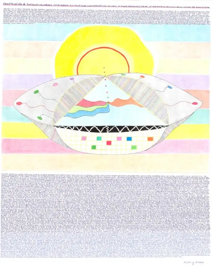 Sí hijito; así es; el número 318 nace viviente; es decir que siente; así también nacen los platillos voladores; cuando estas naves sienten que sienten, ven y oyen todo cuanto sucede alrededor; nacen con libre albedrío; y lo conservan por toda la eternidad; ellos ven su proceso de materialización; ven como el metal plateado las invade y sienten que van pasando a otra dimensión; sienten que nacen de nuevo; y que un pasado vá quedando atrás; tal como la criatura pensante que intuye un pasado espíritual; lo de arriba es igual a lo de abajo; en el dibujo se pueden apreciar ocho cuadritos de colores; estos corresponden a ocho vibraciones solares; a cada vibración solar, brota un torrente de moléculas; estos cuadros solares representan la geometría humana; la única que nació con el espíritu humano; del cuadrado solar nació el gérmen humano; y corresponde al punto de vista individual que cada ser humano, tiene del universo; punto de vista es imperfección; corresponde al polvo planetario; un planeta es un puntito perdido y suspendido en el espacio; cuando se crea una nave plateada, ocurre igual; por gigantesca que sea la nave; sólo el Padre es infinito; pues todo lo crea; en el dibujo se vé líneas amarillas que forman cuadros blancos; ello representa la inocencia filosófica de la materia y el espíritu; este color es un primer tiempo de una criatura que será voladora; durante su entrada a otras dimensiones, este tiempo se llama proceso de saturación magnética; corresponde al proceso de nacimiento de una criatura de carne; más conocida en el Reino de los Cielos, como reencarnación; es decir, regreso a una materia ó galaxia llamada carne; y es también un regreso a una determinada dimensión; a un punto donde debe reconocerse; antes de llegar a ese punto, el espíritu duerme; pero es un sueño-vida; pues vé, siente y oye; es un atributo de su inocencia; que dura mientras viaja por el infinito; y a medida que vá acercándose al punto de reconocimiento, lo que vé, siente y oye, es como un universo que vá quedando atrás; y comienza en él, el olvido de su pasado; así también ocurre con ciertas naves plateadas; tienen un olvido de su pasado; no recuerdan en que puntito del infinito fueron creadas; sólo saben que fueron creadas por mandato divino; y que los grandes soles, les proporcionan el alimento diario; el magnetismo solar; y saben que sólo exsiste un sólo Dios nomás; en el dibujo se puede ver una zona negra; en que se ven rayos de fuego solar; significa que toda evolución, lucha siempre contra una imperfección; el color negro es color de tinieblas; y es a la vez, magnetismo en estado de decisión; pues todo es viviente en el universo expansivo del Padre Jehova; el magnetismo en estas naves, son una fuerza creadora dentro de la misma creación; se diferencia del magnetismo humano, en que éste es gobernado por tal magnetismo; en los platillos voladores, son las criaturas espírituales las que gobiernan; pasando a ser los mundos y dimensiones del infinito inteligencias subordinadas; pues la frecuencia solar de sus moléculas, son producto de aquéllas; es como el hijo que reconoce al padre; la frecuencia menor, se somete a la mayor; esta revelación explica lo siguiente: desde el mismo instante en que el divino Padre inició su creación, surgió en ella la antiguidad; un mundo nace porque salió de una idea que es más antigua que dicho mundo; y la idea perteneció a una de las criaturas del antiguo mundo; pues los mundos materiales desaparecen y las ideas nó; las ideas que generáis a diario en vuestro vivir, viajan al espacio; de ellas nacen los futuros planetas; pues escrito fué: Hay que ser chiquitito y humilde, para llegar a ser grande en el Reino de los Cielos; ¿qué más chiquitito al grado de ser invisible, que una idea? ¿que se piensa y se crea en la mente y no se deja ver? ciertamente que vuestras ideas, constituyen lo más microscópico que poseéis; es por eso que fué escrito: Cada uno se hace su propio cielo; porque las ideas nacen de vuestras propias mentes; así también los platillos voladores nacen de los soles; que son fuegos mentales mayores; la mente humana es un fuego mental menor; ambas son fuego; tanto arriba como abajo; y hacia donde se dirija la mente, es fuego; que se manifiesta en infinitas formas; pues la variedad en la creación del Padre, es infinita; es por eso que fué escrito: De todo hay en la viña del Señor; esta divina variedad hace que en el universo expansivo pensante, exsistan otros universos y otros dentro de otros; aquí no cuenta el cálculo humano; porque antes que él, ya hubieron infinitas matemáticas de planetas tierras; que ya no están en el espacio; y antes de aquello, hubieron futuros mundos; no sólo mundos terrenales; que son casi desconocidos en el Reino de los Cielos; mundos colosales; en que una de las moléculas de esos mundos, son infinitamente más grandes que vuestro planeta Tierra; más, esto no significa que esos colosales mundos, sean el límite; no; porque jamás habrá límite alguno; no lo hubo, ni lo hay ni lo habrá; pues las ideas salidas de esas gigantescas criaturas, crean otros mundos más gigantescos aún; y así remontáos por toda la eternidad; hasta donde vuestra mente pueda imaginar; estos mundos pertenecen al macrocosmo; y vuestra Tierra al microcosmo; Macro es mayor y Micro menor; es por eso que mi divino Hijo Solar Cristo os dijo: De donde yo soy, ustedes ni pueden ir; aludía a estos colosales mundos; de allí él vino a visitaros; vino en realidad, a un mundo infierno; donde monitos de carne, se odiaban unos a otros; se esclavizaban unos a otros; se explotaban unos a otros; se engañaban unos a otros; era en otras palabras, un mundo-infierno; un mundo que se creaba y aún se crea sus propios yugos; porque la filosofía escogida por los espíritus humanos, contiene el bién y el mal; y la razón de su exsistencia es probar la vida; ó se vá para el bién, ó se vá par