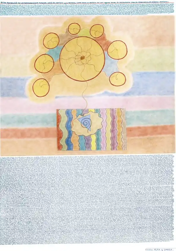 Sí hijito; este dibujo celeste explica infinitas verdades; explicar el orígen de la vida, es explicar multitudes de seres vivientes; pues todos poseen una individualidad diferente; lo que demuestra que teniendo un mismo principio creador, tienen diferente sentir; diferente historial; diferente experiencia; diferente manera de ser; diferente manera de pensar y actuar; diferentes en las características físicas y diferentes en sentimientos; diferentes en los hechos vividos; diferentes en lo más microscópico; y diferentes hasta el último suspiro de vida; esta infinita variedad en la materia y el espíritu, son salidos de un mismo punto; al crearse cada espíritu, sus elementos tienen ya un pasado viviente; este pasado es solar; todos poseen en sus cuerpos electricidad solar; toda manera de pensar diferente, sale de este foco eléctrico; que si lo llevamos con la mente al tamaño colosal, tendremos un verdadero sol del macrocosmo; todo el pensar humano sea cual sea su individualidad, es fuego viviente; es una réplica microscópica de lo que sucede en los grandes soles del espacio; lo de arriba es igual a lo de abajo; hay creación arriba y hay creación abajo; cada espíritu salió de un sol-virtud; o bién de un número-espíritu; pues todos en el Universo, son producto del número viviente salido del cálculo viviente, de un Dios viviente; desde el mismo instante que se crea un espíritu, nace con él el número; nacen con él, las matemáticas; son números que carecen de filosofía; son números en estado de inocencia; lo que significa que se es ángeles de pureza, antes de conocer filosofías en los lejanos planetas; el principio de la vida es relativo; pero infinito; ni los grandes soles lo saben; sólo el divino Padre Jehova lo sabe; esto significa que exsisten infinitos principios de creación; que tomados en su conjunto, quedan reducidos a lo microscópico frente al libre albedrío del Creador; es como las líneas de fuerza de un imán; los soles son fuerzas creadoras; que fueron a su vez creadas; y el Creador también es fuego; el divino Padre se reserva la divina ley de como surgió él; no es egoísmo; como podría suponerse; sino, que ningún conocimiento le entendería; teniendo poder infinito para ser entendido; toda evolución tiene sus leyes escritas, antes que nazca como evolución; el divino Padre jamás se retracta; jamás anula una ley, dictada por él mismo; y si la experiencia supone lo contrario, esa suposición es también relativa; y deja de ser experiencia en otras evoluciones del espacio; donde ya pasaron en la eternidad y el tiempo, la misma característica que tiene la llamada experiencia humana; lo de arriba pasó por lo que están pasando los de abajo; se asciende hacia los cielos, probando el sentimiento desde su grado más microscópico; tan microscópico, como vuestra mente pueda imaginar; y lo más microscópico que podéis imaginar, son vuestras ideas; son tan microscópicas, que sólo las sentís y no las véis; ni sabéis hacia donde se dirigen ellas; más, no podéis negarlas; pues sin ideas no podríais progresar; no conoceríais la vida; las ideas que conocéis fueron pedidas por vosotros mismos en el Reino de los Cielos; todas las ideas que creásteis en la vida, os esperan en el Reino; pues siendo microscópicas y humildes, son las primeras en el Reino de los Cielos; allí se transforman en filosofías vivientes; es como un hijo que espera el retorno de su padre; pues vuestras mentes las crearon; y como vosotros tenéis un divino Creador, las invisibles ideas también lo tienen; y es el mismo Dios de ustedes; ¿no se enseñó un sólo Dios nomás? el Dios viviente tanto para la materia como para el espíritu; tanto para lo conocido y lo desconocido; lo desconocido es también relativo; pues también avanza paralelo a la relatividad de lo conocido; todo conocido tiene su desconocido; nadie lo sabe todo; sólo el Padre lo sabe; lo desconocido es la suprema prueba en la espíritualidad humana; es la espera a lo largo de una exsistencia; es un olvido del pasado cargado de incertidumbre; una incertidumbre que el hombre la hace más amarga aún; pues exsiste también dulce incertidumbre; el egoísmo humano hace que la vida humana, sea un valle de lágrimas; los hombres explotan porque ellos quieren; escandalizan también; porque así lo quieren; hacen la guerra y la explotan porque sus libres albedríos están con el demonio; quien tenga ideas de guerra, más le vale renunciar al puesto que tenga en ella; porque por sobre toda filosofía demoníaca está primero la divina Palabra del Creador de la vida; ningún derecho les asiste a estos demonios, destruir mi creación; ¡pobre de todo aquél que viste uniforme! pues se le restarán de su eternidad, todos los segundos transcurridos en que usó uniforme; no se puede servir a dos señores; no se puede servir a dos filosofías; o se mata y se es demonio, o se crea y se es de la Luz; todas las filosofías que contiene cada idea salida de vuestras mentes, son juzjadas y pesadas en el Reino de los Cielos; y ellas son tan vivientes como lo sóis vosotros; y os esperan vuestro regreso; el Universo Expansivo y Pensante es Universo viviente; tanto arriba como abajo; tanto en lo microscópico como en lo macroscópico; en lo visible y lo invisible; en lo conocido y desconocido; hasta vuestras ideas son vivientes; todas vuestras ideas forman en su conjunto un conocimiento; y todo conocimiento una jerarquía; y de esto se crea vuestro futuro cuerpo; sóis por lo tanto criaturas salidas del conocimiento; conocimiento creado por vosotros mismos; el conocimiento es variado; el divino Padre toma lo suyo; toma la ganancia espíritual del conocimiento; de vosotros mismos sale lo que merecéis; pues libre albedrío tuvísteis en la vida; más, ¡pobres de aquéllos que han atropellado ó modificado por egoísmos pasajeros, el libre albedrío de mis criaturas! a los tales más les valdría, no haber pedido experiencia 
