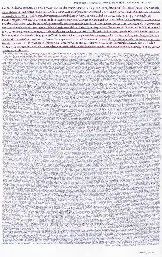 TÍTULO: ENTRE LA DIVINA REVELACIÓN Y LAS REVOLUCIONES DEL MUNDO, EXISTE LEY COMÚN; REVELACIÓN, SIGNIFICA REVOLUCIÓN EN EL REINO DE LOS CIELOS; PORQUE LO DE ARRIBA ES IGUAL A LO DE ABAJO; LA REVELACIÓN O DIVINA ESCRITURA TELEPÁTICA, UNIFICARA AL MUNDO DE LA FE, AL TERCER MUNDO; MUNDO DE LA TRINIDAD, EN LA PROPIA ESPIRITUALIDAD; LA DIVINA PARÁBOLA QUE FUE DADA AL MUNDO, HACE YA MUCHOS SIGLOS, QUE DICE: TODO HUMILDE ES PRIMERO, DELANTE DE DIOS, SIGNIFICA QUE TODAS LAS NACIONES LLAMADAS SUB-DESARROLLADAS, SURGIDAS DEL EXTRAÑO Y DESCONOCIDO SISTEMA DE VIDA, SALIDO DE LAS LEYES DEL ORO, SE UNIFICARÁN FORMANDO UNA SOLA POTENCIA; CIENTO OCHO PAÍSES INICIAN EL MÁS FORMIDABLE PODER, QUE SE HAYA CONOCIDO EN ESTE MUNDO; NI ANTES, NI AHORA, NI EN LO FUTURO, SE VERÁ COSA IGUAL; TODA NACIÓN RICA SALIDA DEL EXTRAÑO SISTEMA DE VIDA DEL ORO, QUEDARÁN EN LA MÁS GRANDE POBREZA; EL DIVINO CREADOR DA Y QUITA EN TODO LO IMAGINABLE; LOS QUE MÁS TUVIERON EN LA PRUEBA DE LA VIDA, SON JUZGADOS POR SUS PROPIOS Y EXTRAÑOS PROCEDERES; CON LA VARA QUE MIDIERON A OTROS, SON ELLOS MEDIDOS; HICIERON SENTIR LA POBREZA A OTROS POR SIGLOS, AHORA ELLOS VIVIRÁN LA POBREZA EN CARNE PROPIA; PORQUE NO IMITARON A LA DIVINA IGUALDAD, ENSEÑADA POR EL PADRE, EN SU DIVINO EVANGELIO; CON LAS LLAMADAS NACIONES RICAS, SE INICIA EN ESTE MUNDO, UNA ÉPOCA QUE FUE ANUNCIADA, COMO EL LLORAR Y CRUJIR DE DIENTES.-