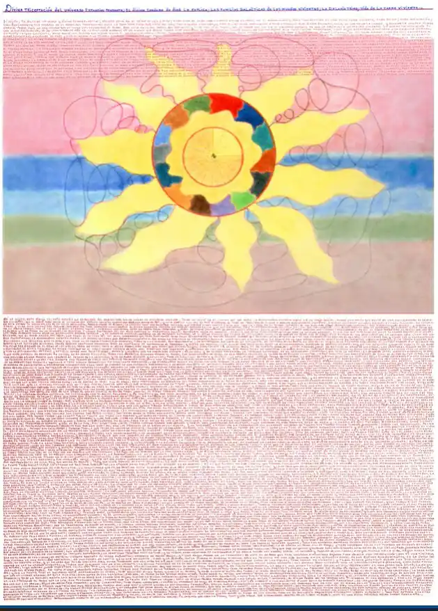 Así es hijito; este dibujo celeste enseña la expansión del magnetismo solar sobre el universo viviente; todo se inició en el centro del sol Alfa; la microscópica chispita vibró en su viaje inicial; formó un recta que salió de una muchedumbre de criaturas vivientes; que al darle paso hacia el exterior del espacio infinito, formó un ángulo recto de 90o; y este ángulo a la vez se fué dividiendo de tres en tres; dando lugar a nuevas dimensiones vivientes; a nuevas chispitas solares; a nuevos futuros planetas; la chispita en este estado de inocencia, era de un color brillante; predominando el blanco; la chispita pasó por infinitos colores; que fueron otros tantos cielos que tuvo la Tierra en su pasado infinito; el sol Alfa aún sigue produciendo chispitas; aún sigue creando mundos; y pasará la Tierra y el sol Alfa seguirá aún creando; seguirá por toda eternidad cumpliéndose el divino mandato viviente que ordenó: Hágase la luz y la luz fué hecha; sólo te he mencionado un sólo sol; los que han cumplido este divino proceso, aún lo cumplen; su número no lo puede medir la mente humana; por lo tanto se dice exsisten tantas lumbreras creadoras, como la mente pueda imaginar; y éstas se vienen sucediendo de antes de los actuales soles; esto último es para explicar los tiempos transcurridos; en que el siglo terrestre, es menos que una gota de agua que se pierde en un océano; los puntitos ó líneas punteadas del sol Alfa explican el magnetismo solar; irradiando hacia un exterior; es decir que de lo microscópico interior nace lo colosal exterior; es por eso que toda criatura lleva su verdad dentro de sí mismo; las ideas humanas nacen desde un microscópico gérmen interior; y se expresan materializándose en un presente exterior; es el mismo proceso que ocurre en los lejanos soles; lo de arriba es igual a lo de abajo; este gérmen es tan microscópico que la criatura sólo siente sus sensaciones; que el mundo conoce por ideas; las zonas de colores del Sol Alfa, demuestra que todo sentimiento es un color determinado; no exsiste pensar alguno que no posea color; ni color que no sea producto de un pensar; de una idea; los colores son y serán las mismas naturalezas planetarias; la microscópica chispita poseía los mismos colores que posee actualmente el sol Alfa; la herencia se transmite; tanto al espíritu como a la materia; la herencia es una misma; pero se manifiesta en infinitos libres albedríos; si la ciencia humana ha descubierto los microbios, esto se debe a que ellos en su propia filosofía de microbios, pidieron a su Creador ser descubiertos; en determinado instante de la evolución; el sentirse descubierto, es una de las leyes de la filosofía microbiana; el hombre también fué microbio punzante; y los actuales microbios serán mañana criaturas humanas; decir lo contrario es acapararse el progreso; y negar sus propias leyes evolutivas; esto quiso decir la divina parábola; aludiendo al universo viviente: Hay que ser chiquitito y humilde como lo es un microbio, para ser grande en el Reino de los Cielos; nadie es menos ante el divino Padre; sino aquél que niega sus divinas leyes; simplemente la criatura mala, es un espíritu rebelde; y todo rebelde jamás ha entrado al Reino de los Cielos; las criaturas poseen en sus individualidades, su propia Trinidad; la divina Trinidad es el conocimiento viviente de cada uno; mientras más abnegada y luchadora es una criatura, más poder tiene su Santísima Trinidad; hasta el invisible microbio posee su divina Trinidad; también la posee todo lo conocido y lo desconocido; materia y espíritu hacen una sola Trinidad; materia y espíritu son un comunismo viviente; en el Cielo y en su paso por la vida; la Trinidad universal es el comunismo celestial; que todo lo unifica; la desunión de los espíritus humanos, se debe a que todo espíritu es probado en la vida; en su propia filosofía; todos los espíritus humanos vienen al mundo, con conocimiento de causa en sus propias pruebas; el olvido de un pasado celestial, le fué impuesto con conocimiento de ello; el olvido no fué total; la divina intuición es una puerta que conduce al pasado de la criatura; y es un poder viviente y relativo; todo es relativo; materia y espíritu; la relatividad también posee su Trinidad; la siguiente y divina ecuación lo explica: Relatividad universal = a una expansión con principio solar,= un destino viviente con prueba de vida = una posición pensante pasajera = una creación con olvido momentáneo de su orígen = una vibración con infinitas leyes de sentimientos y hechos materiales = una creación de fuego solar compuesta por un magnetismo viviente = equivale a tres líneas magnéticas en constante evolución = un microscópico fuego en divina caloría pasional = un divino querubín de la relatividad = una filosofía eternamente cambiante = una evolución del espíritu con infinito número de nacimientos = nacimientos consecutivos a las ideas ya creadas en una anterior exsistencia = un divino mandato de infinitos mundos de la relatividad = una nueva forma de vida con filosofía propia = una transformación magnética que se efectúa en el Reino de los Cielos = una saturación de fluídos vivientes llamados virtudes = una criatura con nueva Trinidad = jerarquía relativa a su propio libre albedrío = un futuro sol viviente con filosofía propia = una divina virtud de conocimiento relativo = un hijo mayor en constante perfeccionamiento relativo = un futuro primogénito solar = un fruto viviente que materializa mundos = una fuerza creadora de tercera categoría galáctica, en un todo universal relativo = una divina criatura que penetra tanto al mundo material como al mundo espíritual relativos = una filosofía con destino relativo; según ideas relativas con un Juicio divino relativo = un Juicio universal, con repercusiones en espíritus relativos según sus obras = un futuro y cercano llorar y