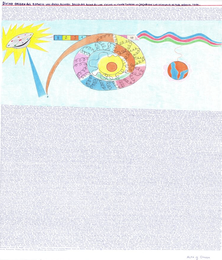 Sí hijito; este dibujo celeste demuestra que la divina Justicia esta en todo espacio; la vara conque mides y que serás medido; la Vara son la Moral de mis Mandamientos; y que cada uno debió cultivar en la vida; si no se cultivó por un microscópico instante, no se entra al Reino de los Cielos; en cada acto realizado por vuestra mente, entra espacio; las ideas tienen pausa; y las pausas son espacio y tiempo; y filosofía; el espacio posee una psicología en que espera la acción espíritual; y está para todos los pensares; el espacio lo es por igual para la materia y el espíritu; también nace microscópico; como toda la creación viviente del Padre; todo espacio posee leyes físicas y espírituales; vuestra ciencia algo sabe de la física del espacio; y del tiempo; la física hace uso de espacio y tiempo en los cálculos mentales; además del espacio y tiempo que corresponde al mundo exterior; he aquí una de las causas de la imperfección humana; hace cálculos en que no participa la eternidad; la mente humana es una octava vibrante de un microscópico círculo Omega; quiere decir que es una réplica salida de un círculo solar; el número ocho representa una filosofía pasajera; porque la vibración octava, retorna a su centro; todo espíritu humano es un desprendimiento de un fuego solar; y su alejamiento incluye tiempo y espacio; la octava vibrante es un recorrido del espíritu por una dimensión; cuyos elementos también pertenecen al mismo centro de fuego solar; hubo un instante en que todo espíritu conversó en tiempo espíritual, con los mismos elementos constítutivos, de la naturaleza terrestre; este entendimiento es conocido en el Reino de los Cielos, como principio Alfa de un Arca en Materialización de Alianzas; en la Tierra, es conocido como reencarnación; y mi divina Palabra la designa como un nacer de nuevo; una ley se puede expresar de muchas formas; y no deja de ser la misma ley; en todo nacer de nuevo, para el espíritu humano, participan 318 virtudes vivientes; a este conjunto de virtudes se le llama un Arca de Alianza; ó pensar de un espíritu humano; el arca de las alianzas fué conocido por el mundo antiguo; en el arca de las alianzas, entra toda la creación; todos los elementos del Universo; y todo cuanto la mente pueda imaginar; porque todo exsiste en la creación del Padre; y nada es imposible en el más grande Creador de creadores; pues nadie supera al Padre Jehova; el tiempo y el espacio forman parte del todo sobre el todo; porque nada exsistiría sin ellos; exsisten espacios y tiempos, como mundos exsisten en el Universo; y su variedad es tan infinita, como el número de arenas que contiene un desierto; lo viviente hace lo expansivo; todos tienen derecho al infinito; y nadie es desheredado; el espacio y el tiempo se unen según sus libres albedríos; tal como estáis juntos vosotros en el mundo; y tal como está una molécula junto a la otra; nadie está al azar; porque tal filosofía está expuesta al extravío; tal como se extravían los que defienden a satanás; porque el maldito se cree que él se manda; todo el universo de la Luz, nada quiere con él; y quien enseña una filosofía que no tome en cuenta mis divinos Mandamientos, se extravía; porque no entra al Reino de la Luz; tal es la suerte del yugo de la Tierra; llamado capitalismo; y que en el Reino se conoce por la gran bestia; una maldita filosofía que desde tiempos remotísimos, viene esclavizando a los mundos de la Luz; ninguno de estos demonios explotadores, quedará; porque no hay espacio ni tiempo, que no se cumpla; hasta vuestra exsistencia carnal, tiene su fín físico; todo espíritu capitalista o de cualquiera otra inmoralidad, tendrá que enfrentarse con sus 318 virtudes vivientes; todas ellas pidieron en el Reino, no violar la Ley; y pidieron vivir en un lejano planeta llamado Tierra, la más alta Moral que mente alguna puede concebir; la Moral única de mis Mandamientos; todas vuestras virtudes, jamás se dejaron ver en la vida; porque su humildad es el más sublime modelo de perfección; siendo ellas invisibles en vuestro propio pensar, son grandes en el Reino; a ellas escucha primero el Creador de la vida; y vuestro espíritu es el último en ser escuchado; ¿No se os enseñó ser humildes? allí en el Reino, esta virtud es la reina entre todas; y quien no vivió en humildad, no entra al Reino de los Cielos; las virtudes adquieren proporciones colosales; y vuestro espíritu se vé como un microbio del polvo; en los espíritus que no, cultivaron la humildad, el pavor se apodera de ellos; porque siente que las tinieblas y la Luz, se lo disputan; todo humilde siente una paz espíritual; porque en la vida sirvió a un Señor; sirvió a una causa; y no se dividió; los que sirven a dos señores, a dos causas sirven; a dos pensares filosóficos sirven; es por eso que llegado al Reino para rendir Juicio de prueba de vida, su espíritu se vé impulsado a una lucha; una lucha en que las tinieblas tratan de atraérselo; porque en el Universo viviente del Reino de los Cielos, exsisten leyes de la posesión viviente; vuestro orígen fué sacado de las tinieblas del Macrocosmo; porque de todo hay en el rebaño del Padre; la prueba de vuestra vida, es una prueba en que vosotros mismos escogéis el resultado de ella; ¿No tuvísteis libre albedrío en la vida? ¿y no se os dió Sagradas Escrituras y Mandamientos? ¿qué hicísteis con ellos? Sé que estáis sometidos a un yugo; impuesto por los demonios de la ambición; más, vosotros mismos pedísteis correr el riesgo; he aquí la causa de todos los riesgos en la vida; ningún demonio que provocó riesgos, en la vida, entrará al Reino de los Cielos; y el peor de los riesgos y del cual salen todos los demás, es el daño que se hace al semejante; explotar a los demás es el gran riesgo; de esta filosofía demoníaca sale la misma perdición de la humanidad; porque ninguno de vosotros entra al Reino; basta un microscópico segundo ó me