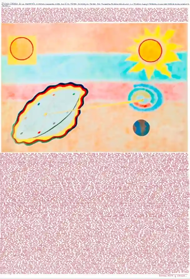 Este dibujo celeste explica en una de las infinitas formas, que el divino Padre puede explicar, el principio de la Tierra; el principio de la Tierra es un principio que se puede explicar de muchísimas formas; pues siendo una creación viviente, la explicación está en todas las mentes; diversificada según la evolución espíritual de cada uno; y todas son valederas; lo que no exsiste en la Tierra, exsiste en otras moradas; y en una cantidad tal, como la mente pueda imaginar; de todo hay en mi rebaño universal; por lo tanto no se debe ridiculizar a nadie por sus teorías; quien ridiculiza a un hermano, al divino Padre ridiculiza; pues estando el Señor en todas partes, también está en la mente de todo ridiculizado; cada teoría es un acto de fé intelectual; escrito fué que la fé mueve montañas; mueve ideas que serán futuros planetas; en el dibujo podemos apreciar un sol de geometría cuadrada; este sol Alfa, muestra una de las infinitas formas geométricas, en que conviven los soles vivientes; así como la criatura humana se estira y se encoje, así también hacen los soles; lo de arriba es igual a lo de abajo; la diferencia está que las lumbreras solares, han recorrido una evolución que los humanos deben recorrer; las criaturas de la carne son soles microscópicos; que sólo sienten una electricidad física; más, no ven aún su propio brillo; están en los primeros peldaños de un magnetismo viviente; que no los abandonarán jamás; pues la eternidad naciente así se expresa; cuando la microscópica chispita de la que sería la Tierra, salió del sol Alfa, éste tenía la forma cuadrada; este cuadrado solar estaba en el exterior del sol; en su interior se reagruparon infinitos y divinos querubínes solares; que son las inteligencias magnéticas que gobiernan toda molécula; esta reagrupación, formó un ángulo recto de 90°; y desde su vértice, emergió la microscópica chispita del futuro planeta Tierra; la chispita planetaria no venía sola; junto con ella venían y aún vienen, otras infinitas chispitas; que serían y son otros planetas; El sol Alfa sigue aún produciendo chispitas de futuros mundos; y así será por siempre jamás; la chispita microscópica habiendo salido del sol Alfa, divina filosofía viviente del sexo masculino, fué atraída por el sol Omega; símbolo viviente de la filosofía femenina; ésta es una atracción magnética solar; los soles poseen sexos; tal como lo poseen las criaturas de la naturaleza; lo de arriba es igual a lo de abajo; la chispita salida del sol Alfa, posee libre albedrío viviente; la atracción que ejerce el sol Omega sobre ella, es atracción amorosa viviente; es un amor que incluye materia y espíritu; al acercarse la chispita, es magnetizada; esta divina ley es igual a como una madre terrestre recibe la fecundación de un hijo; la atracción es irresistible; es una atracción magnética; que incluye toda la atracción, de lo que será una futura naturaleza; la chispita se vuelve infinitos colores; que tienen dentro de sí mismas, todos los fenómenos futuros de un planeta; la chispita está en su divino principio de inocencia; es en este principio que la chispita es de color Blanco Brillante; su filosofía inocente representa la leche universal; es así que exsistieron en la chispita, mares de leche; causa divina de todos los líquidos; pues todo, materia y espíritu tuvieron el principio lechoso solar; esta leche era un gas; que se fué transformando a infinitos colores; fueron enormes presiones relativas de calorías; calorías que escapan al cálculo humano; estas calorías eran y son expansivas en magnetismo; eran creadoras de materia; el desarrollo de una caloría, produce materia; las calorías tienen un límite; y cuando se sobrepasa el límite de esta caloría, se produce materia; la materia es infinitamente relativa a su propia caloría primitiva; no es igual en los planetas; lo viviente posee categoría colorífica; es una escala que no tiene fín; pues exsisten primitivas calorías, como mundos hay; toda idea es una microscópica caloría, de un futuro planeta; la vida misma, es una infinita suceción de calorías; la caloría es producto de las ideas de las criaturas de carne; y la carne es producto de la caloría; y todo se vuelve caloría; se vuelve espíritu viviente; el pensamiento también es caloría viviente; pues toda idea es pensante y vibratoria; al decir vibratoria quiere decir que cada sentimiento de la idea, es un magnetismo de atracción viviente; que trata de crear su propia individualidad infinita, dentro del mismo infinito; la intención antecede a la dimensión; antecede a su propia geometría; de la misma idea nace la geometría de un futuro planeta; y todas las filosofías de sus criaturas; cada idea posee un número individual viviente; cada cual es creador de sus propias matemáticas; la individualidad de cada uno, es una numeración eterna; de esta numeración salen las futuras exsistencias; cada exsistencia es un divino cálculo matemático; sacado de las propias obras del espíritu, escrito fué que seréis juzjados según vuestras obras; quiere decir que cada uno, al venir a la vida, se constituyó en su propio constructor de sus futuras exsistencias; la más perfecta exsistencia, pertenece a aquél espíritu que se ha guiado en la vida, por la suprema moral de los divinos Mandamientos; segundo tras segundo; a lo largo de su vida; esta divina ley provocará a millones y millones de seres, un llorar y crujír de dientes; las escenas más desgarradoras presenciará el mundo; sobre todo en la clase de los llamados ricos; que se alimentaron de una filosofía, contraria a los divinos Mandamientos; y el mundo estudioso sabe que todo árbol filosófico que no plantó el divino Padre, de raíz será arrancado; el poder divino está en todas las mentes; se le enseñó al mundo que el Creador está en todas partes; por lo tanto todo rico, de la riqueza basada en la explotación del hombre por el