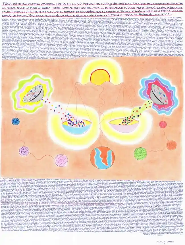 TÍTULO: TODA EXTRAÑA ESCENA AMOROSA, HECHA EN LA VÍA PÚBLICA, ES PUNTAJE DE TINIEBLAS PARA SUS PROTAGONISTAS; TAN EXTRAÑA MORAL, NADIE LA PIDIÓ AL PADRE; TODO INMORAL QUE HIZO DEL AMOR, UN ESPECTÁCULO PÚBLICO, NO ENTRARÁ AL REINO DE LOS CIELOS; TALES INMORALES TIENEN QUE CALCULAR EL NÚMERO DE SEGUNDOS, QUE CONTENÍA EL TIEMPO DE TODA INMORALIDAD PÚBLICA; CADA SEGUNDO DE INMORALIDAD EN LA PRUEBA DE LA VIDA, EQUIVALE A VIVIR UNA EXISTENCIA FUERA DEL REINO DE LOS CIELOS.-