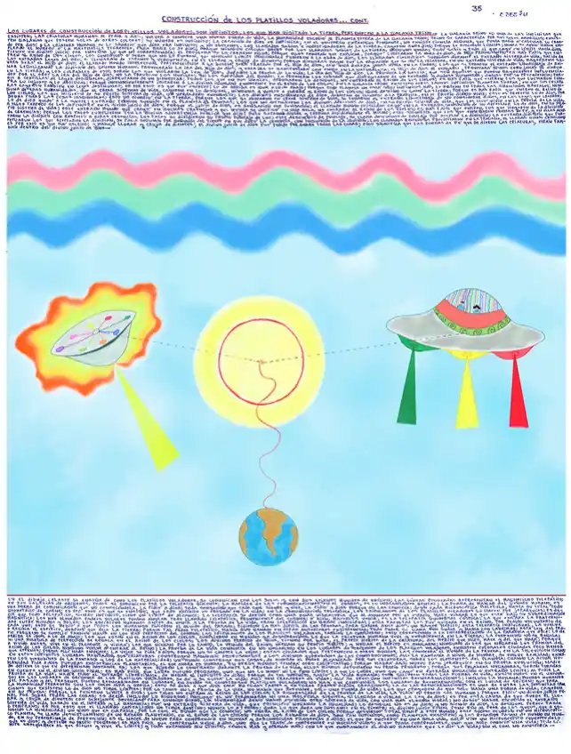 en el dibujo celeste se enseña de como los platillos voladores, se comunican con los soles y con sus lejanos mundos de orígen; las líneas punteadas representan el magnetismo telepático; en sus galaxias de orígenes, todos se comunican por la telepatía viviente; la rapidez de las comunicaciones en el cosmos, es lo instantáneo mental; la forma de hablar del género humano, es una forma de comunicación que no conociéndola, la pidió a dios; toda sensación que cada cual siente y vive, la pidió a dios porque no las conocía; desde cada microscópica molécula, hasta su total todo geométrico de carne; es por esto es que se enseñó, que todo espíritu es probado en la vida; en la comunicación telepática, los tripulantes de los platillos voladores lo hacen por jerarquías; es decir que todo telepático, siendo infinito, tiene un límite de alcance; la telepatía se define como una onda vibratoria que al avanzar por el espacio, hace vibrar lo que está bajo su subordinación magnética; los más elevados padres solares pueden anular todo llamado telepático, proveniente del cosmos; ó bién, hacerlos venir; es la Telepatía Universal Cósmica; la que enlaza la fraternidad entre mundos y soles; los espíritus humanos antes de venir a la prueba de la vida, eran telepáticos en grado individual; esta facultad les fué quitada en el Reino, por pedido voluntario de cada uno; esto se debió a que todos los humanos pidieron el olvido del pasado; pidieron la más difícil de las pruebas, para ganar ante dios, un mayor mérito; esta telepatía individual, la vuelve a recibir el espíritu, después que deja la Tierra; porque tal poder telepático, había sido ganado en otras anteriores exsistencias; todo poder se gana con sudor y hasta con lágrimas; esta ley del propio progreso se cumplió también hasta en los más perfectos del cosmos; los tripulantes de los platillos voladores, también la cumplieron; esto corresponde a la interpretación de la parábola que dice: Lo de arriba es igual a lo de abajo; los que están en el Reino de los Cielos, cumplieron en mundos ya desaparecidos, lo que la criatura humana vive y experimenta en la Tierra; la perfección no se regala; ni una molécula de perfección se regala en el Reino de los Cielos; los divinos premios de dios, tienen por base, el propio mérito de la criatura; del mérito que hizo, hace y del que hará; porque a vivido antes, vive en el presente y vivirá; los que niegan por lo tanto, lo venido del Reino, niegan su propio mérito; y negar el mérito es anularse; ninguno de los que negaron los premios del Reino de los Cielos, ninguno vuelve a entrar al Reino; la prueba de la vida consistía en no negarlos; en los lugares de orígenes de los platillos voladores, exsisten colosales ciudades poco menos que eternas; porque allí nada envejece; la vejez se pide a dios, porque no se conoce la vejez; estas ciudades que pertenecen a otros mundos, las conocerá el mundo de la prueba, en la television solar; en estos infinitos lugares habitados, sus criaturas construyen mandando amorosamente a los divinos querubínes de las construcciones; allí la fantasía a nivel de hombre, se vuelve realidad; exsisten los querubínes de la fantasía y los de la materialidad; un mundo construye sus casas, de acuerdo al poder alcanzado por sus criaturas, sobre los elementos del planeta; cuando la actual humanidad pida a dios futuras exsistencias planetarias, el que ahora es hombre, en otros mundos tendrá otro calificativo; porque habrá dado nuevo paso jerárquico en su propia evolución; nadie se detiene lo que en determinado instante es; los que dijeron lo contrario durante la prueba de la vida, ellos mismos detuvieron su propio progreso; porque sus palabras negadoras, serán tomadas en cuenta en el divino juicio final; es más fácil que logre futuro progreso, uno que no lo negó ni le puso límite; a que lo logre, uno que cayó en extraña negación ó extraño límite; al pedir la prueba de la vida, nadie pidió el extraño libertinaje, de negar el infinito de dios; porque de tal infinito, salió la vida humana; como salieron todas las formas de vida, exsistentes en el universo; en los lugares de orígenes de los platillos voladores, se dá y se quitá la vida; allí son creadores de vidas; allí se efectúan infinitas reencarnaciones; incluso la humana; muchos humanos del pasado y del presente fueron reencarnados en lugares, en donde se construyen platillos voladores; no hay que confundir los lugares de reencarnación, con el lugar de orígen; que para la humanidad terrestre son los soles Alfa y Omega; esto se debe a que dios está en todas partes y en todas partes dirige creaciones; la de las reencarnaciones es una de entre las infinitas creaciones que exsisten; lo de dios no tiene límites; por lo tanto en la prueba de la vida, no había que defender, sólo una forma de vida; los que creyeron de que sólo había una forma de vida, cayeron en su prueba; porque le pusieron límite a dios; los tales no entran al Reino de los Cielos; la rigurosidad de la prueba de la vida, la pidió el propio ser humano; porque pidió un divino juicio final por sobre todas las cosas; es decir incluyó lo riguroso; incluyó el nó perdonarse ni una molécula siquiera, si llegase a violar la ley de dios; es por esta causa de que surge el llorar y crujir de dientes; con semejante severidad para consigo mismo, la humanidad debió haber escogido otro sistema de vida, con una más elevada moral; no debió haber escogido el extraño sistema de vida, basado en el interés y la ganancia; fué un extraño sistema de vida, que principió negando la igualdad; lo desigual no es de dios; y no siendo de dios, lo desigual perece tarde o temprano; es por esto que el llamado capitalismo no tiene destino; nunca lo a tenido; dura lo que dura un instante en el tiempo; el divino juicio final pone fín al peor de los yugos, que a conocido la humanidad; un yugo que es culpable, por la cual el mund