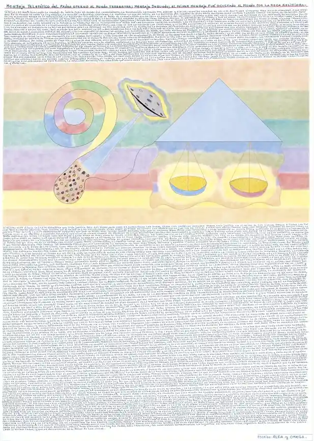 Sí hijito; este dibujo celeste significa que toda justicia sale del mismo modo como se reproducen los seres; todos los espíritus humanos vieron esta justicia en el Reino de los Cielos; porque a todos les fué dado ver su propia justicia; todo exsiste en el Reino de los Cielos; nadie viene ciego al mundo en cuanto a lo espíritual; la justicia se amolda a vuestros actos; porque cada uno prometió hacerse su propio cielo; la Justicia tiene su Ley en los Mandamientos vivientes; que son la misma vara conque seréis medidos; cada una de vuestras ideas posee una intención; y toda intención se vuelve física y viviente en el Reino; la intención es jusjada cuando el espíritu a cometido violación con ella; el Cuerpo Humano es producto de leyes magnéticas; salidas del Macrocosmo; y llamadas leyes divinas; quien niege ser divino en lo microscópico que representa, niega al Padre; que quiere lo mejor para sus hijos; y quien niega al Padre, niega su propia eternidad; porque en infinitos cielos le leen la mente; y cuando esas criaturas celestiales, leen en los espíritus, lo hacen juzjando; quien niege al Padre, los cielos vivientes también le niegan la entrada; lo que se hace abajo, repercute arriba; y a donde vaya vuestro espíritu, la ley es la misma; mis mandatos son iguales tanto arriba como abajo; lo que cambia es la filosofía que por un instante se vive; vuestra justicia es y será espíritual; lo material no queda en vuestra sal de vida; en vuestro conocimiento; la realidad única para todo espíritu, es la eternidad que vive; no es lo efímero; que sintió cuando poseía cuerpo físico; cuerpo de carne que solicitó; y le fué concedido; conceder un cuerpo físico, no es como conceder una cosa cualquiera; el cuerpo es viviente que momentáneamente pidió también tal geometría física; y le fué concedido; la herencia es igual para todos; materia y espíritu tienen derechos iguales; ambas piden; se fusionan leyes espírituales y leyes materiales; conocida en el Reino de los Cielos, como Arca de las Alianzas; porque la materialización de un espíritu, no se hace a la suerte; se hace con responsabilidad; decir lo contrario, es menospreciarse así mismo; y quién se menosprecie, al Padre menosprecia; que se encuentra en él; ¿No se os enseñó que vuestro Creador está en todas partes? ¿en lo imaginado y lo inimaginado? ciertamente que lo sabéis de boca; más, no por conocimiento propio; por esfuerzo propio; por sudor de frente; por mérito propio; el que busca encuentra; porque es premiado en el grado que empleó en la más grandiosa búsqueda; porque podéis buscar muchas cosas en vuestras exsistencias; y si no buscáis al Padre que os dió la vida, no entraréis al Reino de los Cielos; nunca han entrado los ingratos; sólo los humildes; los que soportaron sus propias pruebas en la vida; porque fueron pruebas pedidas por ellos mismos, en el Reino; toda prueba que se pasa en la vida a cada instante, a cada segundo, se pidió; y se os concedió; hasta la forma y característica de vuestras muertes, lo pedísteis; y dentro de vuestras pruebas, pedísteis cumplir la más elevada Moral; la única; porque sin ella no entraréis jamás al Reino de los Cielos; y pedísteis que tal Moral, os fuera enseñada en la Tierra; y se os concedió los divinos Mandamientos; ellos son la vara; porque por ellos seréis juzjados; y así será hasta la consumación de este planeta; bién podrían los espíritus humanos, no estudiarme nunca; más, el no vivir en la Moral de mis Mandamientos, eso es tiniebla; porque nunca entraríais donde está el Padre; es tan inaudito el tiempo que estaríais lejos de la Luz, que tendríais que nacer de nuevo para leer la cifra; lo que no está en vuestra microscópica evolución; la justicia que pedísteis, comienza por lo más microscópico que vuestra mente pueda concebir; así fué, porque lo chiquitito, lo humilde, son primeros en todo; primeros en el Reino de los Cielos y su divina Justicia; y primeros ante el divino Padre Jehova; y lo más microscópico que vuestra mente puede concebir, son vuestras ideas; las mismas que generáis a diario; las mismas que pedísteis en el Reino; las mismas que sentís y que no véis; todas vuestras ideas, viajan físicamente al espacio; ellas tienen el mismo derecho que vosotros; vosotros pedísteis nacer en la materia; ellas iguales; vosotros pedísteis vivir en un tiempo y en un espacio; vuestras ideas, igualmente; lo de arriba es igual a lo de abajo; la herencia de los pedidos es igual en todos; piden los gigantescos y piden los microscópicos; pide la materia y pide la nada vivientes; y todo lo concede el Padre; porque es infinito; vuestras ideas recorren en el espacio, distancias inauditas; distancias que jamás calcularéis; sólo el Padre sabe; vuestras ideas son conocidas en el Reino, como semilla galáctica; porque de ellas nacen vuestros mundos de vuestro propio cielo; escrito fué en mi libre albedrío: Cada uno se hace su propio cielo; porque todos tenéis en forma microscópica, la herencia del Padre; lo que posee el Padre, lo poseen los hijos; tal como ocurre con los padres terrestres; sus características hereditarias son transmitidas a los hijos; lo de arriba es igual a lo de abajo; la herencia que os dió vuestro Padre, fué de inocencia y carente de filosofía; porque es vuestro libre albedrío el que escoge; y todo lo que habéis sido, es mérito vuestro; porque todo se gana con el sudor de frente; con el esfuerzo espíritual; nada hay en la creación del Padre, que no cueste; todo cuesta y costará; porque sin el mérito espíritual de cada uno, no se puede entrar al Reino de los Cielos; las comodidades de vuestro mundo, nada valen en el cielo; toda comodidad disfrutada en el mundo, es premio ya disfrutado; y es por esto que fué escrito: Y obtuvieron su recompensa; todo disfrute material, no es mérito en el cielo; y mucho menos cuando tales disfrutes, son producto de una filosofía que para nada tomó en 