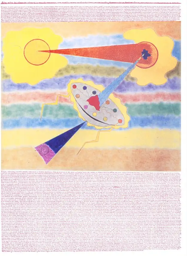 Sí hijito; este dibujo celeste enseña como nació la primera molécula; todo se inició en el sol alfa; y terminó en el Sol Omega; el ángulo recto de 90º del sol Alfa, indica infinitos hechos; la chispita solar es expansiva; y aún en la Tierra, contínua ese desarrollo; el ángulo mismo fue una abertura provocada en el mismo sol; por allí pasaron y aún pasan, infinitas chispitas; de lo que será infinitos planetas tierras; la chispita solar; llevaba en sí misma, la primera molécula de la Tierra; era una molécula infante; flotaba en un gas lechoso; tenía la forma de un microscópico triángulo; poseía espacio y tiempo propio; siendo así, que cada molécula en particular posee tiempo y espacio propios; además del tiempo y espacio material; la primera molécula tenía propiedades expansivas y magnéticas; fueron cambios de temperatura, los que transformaron el fuego de la chispita en corteza sólida; fué y aún es un descenso de temperatura; el fuego de la chispita se dividió en dos direcciones; una descendió al grado más infinito; traspasando todas las escalas caloríficas; y de este descenso de temperatura, nació la primera molécula de agua; por lo tanto, la Tierra y el agua nacieron del fuego; ambas son productos de la madurez de la temperatura; y la temperatura es producto de un fuego solar en infinito descenso; aquí se explican todas las épocas que ha tenido la Tierra; el hombre con Adán y Eva a la cabeza, son recientes; el género humano principia con ellos; pero no son los únicos; de todo hay en el rebaño del Señor; antes de Adán y Eva, hubieron otras criaturas; que correspondieron a otros rebaños; a otras pruebas de vida; a otras jerarquías espírituales; a otros planes divinos de evolución; fueron otras dimensiones; ninguna criatura es exclusiva en los planetas, todas fueron chiquititas y microscópicas; para ser grande en el Reino de los Cielos; ningún ser humano ha visto el pasado de la Tierra; la ciencia terrestre que la estudia, lo hace en grado microscópico; lo hace en su dimensión; y la dimensión humana, es un suspiro frente al pasado geológico de la Tierra, la ciencia terrestre jamás podrá calcular, las clases de vida que hubo en la Tierra; hubieron razas muy superiores a la actual raza humana; superiores en ciencia; en conocimientos; razas que no conocieron el dinero; eran de filosofías más evolucionadas; la mayoría de las pasadas razas, no pidieron en virtud del libre albedrío, venir de nuevo a la Tierra; salvo aquéllos que tenían deudas espírituales pendientes; y muchos de ellos, vieron que en un futuro de la Tierra, aparecerían unos demonios, que crearían un terrible yugo; este yugo es el dinero; la ambición de poner, lo que es pasajero; y no vieron de nuevo a la Tierra, para no corromperse con este demonio; hicieron bién; pues aún están en el Reino de los Cielos; la historia de la Tierra es desconocida, aún para los más sabios; esta ignorancia de su propio planeta, es parte de la prueba de la vida, de cada espíritu humano; sólo la divina Revelación, puede dar la luz; y la Ciencia Celeste la proporciona, como ninguna ciencia humana podrá jamás hacerlo; el divino Cordero de Dios es el infinito conocimiento; que se remonta mucho antes de los actuales soles; de antes que surgieran a la vida, los mundos de carne; el contar la historia de un microscópico planeta como es la Tierra, no es más que recordar, lo que ya ha vivido el divino Cordero de Dios; una antiguidad galáctica, que le dá la primogenitura ante el divino Padre; para comprender tan infinita sabiduría, hay que nacer de nuevo; y como espíritu del universo, leer y ver en la television solar, que están diseminadas en los infinitos soles; sería sí, una maravillosa experiencia, que jamás se llegaría a un término; la divina telepatía de este humilde obrerito del señor, será la maravilla del mundo; pues no hay mayor maravilla, que transformar un mundo, con el conocimiento; he aquí el mayor en el Reino de los Cielos; después del divino Padre Jehova; todo grande en el Reino de los Cielos; es una filosofía, que ilusiona a las criaturas en los mundos imperfectas; es una soberbia propia de los espíritus atrasados; cuando un mundo logra sacudirse este yugo, viene a este mundo, un progreso inaudito; es lo que le ocurrirá a la Tierra; con la divina revelación, que los honorables dalai lamas anunciaran al mundo, caerá el yugo del capitalismo explotador; este yugo que lleva siglos y siglos azotando a los espíritus del Señor, será arrancado de raíz; será la última lucha del demonio en la Tierra; vendrá luego el Milenio de Paz; cuyas generaciones escucharán de los más antiguos, un lejano y tenebroso cuento galáctico; de un demonio llamado dinero; que asoló al planeta por muchos siglos; esto será después de la resurrección de toda carne inocente; el año 2001; en el lejano oriente; sí hijito; así es y así será por siempre jamás; siguiendo con el dibujo celeste, vemos una nave plateada; estas naves entran y salen en todos los soles; ellas participan en grado infinito, en la eterna creación; ellos son los divinos jardineros del Universo Expansivo Pensante; sus naves magnéticas transportan infinitas chispitas solares; que son la semilla galáctica; son las futuras cimientes de futuros mundos; estas naves plateadas, que los hijos de la Tierra llaman platillos voladores, poseen un divino poder inaudito; ellas cumplen leyes solares; la construcción de estas naves, será dada a conocer por el Corderito d Dios; las naves plateadas siempre viajan por dimensiones; es decir penetran los cielos; los cielos están unos dentro del otro; no exsiste el cielo único; los cielos nacen desde lo invisible a lo vísible; y su número es infinito;