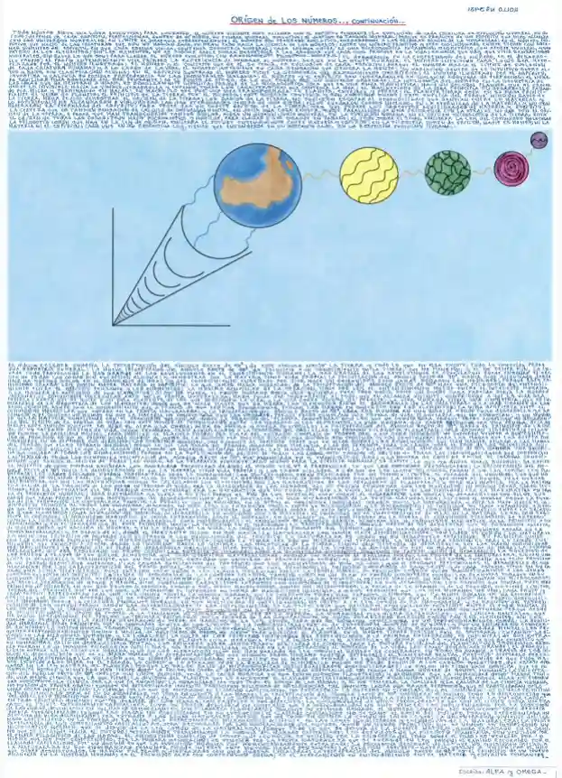 Todo número sigue una línea evolutiva; para lograrlo, el número viviente hizo alianza con el espíritu pensante; la evolución de cada criatura es evolución numeral, en su todo; depende de cada espíritu, perfeccionar dentro de sí mismo, su pensar numeral evolutivo; el destino es también numeral; porque es producto de un espíritu que hizo alianza con los universos numerales, en límite de jerarquía correspondiente; el número sin progreso evolutivo, corresponde a las primeras edades de la humanidad; es el número primitivo que nació de las criaturas que aún no habían dado, un gran paso hacia la ciencia de los números; entre un número primitivo y otro evolucionado, existe tiempo con escenas vivientes del espíritu, en que cada escena vivida, contenía geometría numeral; cada escena vivida, es una microscópica expansión geometrica, con aporte numeral y geométrico de los elementos; sin los elementos, no es posible darle forma geométrica a las escenas que cada cual produce en la vida; es decir que hay que vivir sensaciones numerales, sin saber lo que son; para llegar al número evolutivo, con razonamiento filosófico-numeral; el desarrollo en la comprensión del número, es el desarrollo propio; el propio entendimiento vive primero la experiencia de ignorar al número; surge en la mente humana, el número intuitivo para luego ser reemplazado por el número ilustrado; el número y el concepto que de el se tenía, es exclusivo de cada espíritu; porque el numero marca el límite de evolución de cada criatura humana; y a lo largo de la vida, el número interviene en cada sensacion que genera la mente; su variación dentro de lo intuitivo sufre altos y bajos, sin clasificación alguna; en el espíritu ilustrado el número tiene la geometría del razonamiento geométrico; el número ilustrado por el espíritu, investiga y calcula su posible procedencia en las incontables galaxias; el número y el espíritu son inseparables en cualquier búsqueda de perfección; el número equilibra toda búsqueda del ser pensante; es el punto de apoyo, de lo que podría ser un universo ordenado; la influencia del número en la geometría de las ideas que se generan a diario, es sencillamente infinita; porque de la microscópica idea que es una onda magnética, nace un colosal planeta, que al crecer desde lo invisible hacia lo visible, desarrolla y expande, todas las características que contenía la idea; el magnetismo de la idea principia su desarrollo pasando por micro y terminando en macro; en macro lo que fué una idea transformada en planeta, envejece y perece; el planeta tierra está en su fase principiante de vejez de planeta; el principio de la Tierra, fué el microbio; este microbio contenía y aún contiene fuego; esto explica del porqué ningún sabio de la Tierra, haya podido demostrar el orígen de la Tierra; los sabios de la tierra, no pudieron escapar al desequilibrio que sentían entre lo material y lo espíritual; no alcanzaron a vislumbrar las dos eternidades dentro de una misma; ellos quedaron cortos incluso, en la eternidad de la materia; y no consideraron la eternidad del espíritu; para poder dar un exacto orígen de la Tierra, hay que poseer los conceptos equilibrados de materia y espíritu; la certeza que es también sensación de cálculo de seguridad mental, en decir una cosa remota, exige paralelismo de una psicología con la otra; el no dar con el orígen de la tierra, a pesar que han transcurrido tantos siglos, acusa un desequilibrio numeral, en la evolución humana; en el orígen microscópico de la Tierra, está el orígen de todas las cosas; todo nació microscópico y humilde, para llegar a ser grande en tamaño; el todo sobre el todo, encierra la ley del comunismo molecular la filosofía común que hay en la Ley de orígen, encierra el futuro entendimiento entre materia y espíritu; en la filosofía común de orígen, nadie es menos; ni la materia ni el espíritu; cada uno en su respectiva ley, tienen que entenderse en un instante dado, en la respectiva evolución humana.-