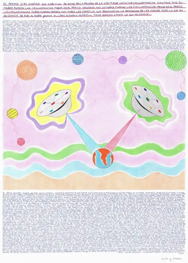 El dibujo celeste enseña que todo cuanto exsiste, exsistió y exsistirá, de los mismos elementos sale; y todo elemento fué idea física; el universo expansivo pensante, ó universo viviente de Dios, fué de orígen microscópico; la eternidad de los universos materiales, tuvo por principio lo invisible; de lo invisible pasó a lo visible; la materia y las criaturas pensantes, vivieron en otras dimensiones; universos microbios, planetas microbios, galáxias microbios, cosmos microbios, con soles microbios; de verdad os digo, que cada molécula de vuestro cuerpo humano, costó sudor de frente; costó muchas exsistencias; costó a vuestro espíritu, volver a nacer, infinitas veces; quien no vuelve a nacer de nuevo, nada ó casi nada sabe del infinito; si el infinito no tiene fín, una exsistencia es como una gota de agua, frente a un océano; el detenerse en un instante, es una de las debilidades de todo espíritu imperfecto; negarse así mismo, su propio infinito; quien así obró en la prueba de la vida, cayó en apocamiento hacia su propio Creador; todo espíritu que en la prueba de la vida, no opuso resistencia mental, a su propio concepto de pequeñez, no volverá a entrar al Reino de los Cielos; porque nadie pidió al Padre, rebajarle en poder, en el lejano planeta Tierra; he aquí la caída de millones de hijos, negadores de su propia eternidad; todo lo que se habló ó se conversó en la prueba de la vida, absolutamente todo, se juzja en el juicio final; letra por letra, idea por idea, concepto por concepto, intención por intención; libre albedrío tiene la letra, libre albedrío la idea, libre albedrío el concepto, libre albedrío la intención; todo lo imaginable posee libre albedrío; y poseyendo el todo sobre el todo, libre albedrío, es que todo se expresa y habla delante del Padre; tal como el espíritu se expresa y habla delante de su divino Creador; si a todos fué enseñado que todos son iguales, en derechos delante de Dios, es que lo conocido y lo desconocido, tienen sus respectivos derechos, en sus respectivas leyes; he aquí otra caída de los que pertenecen a esta humanidad; la mayoría se atribuyó a sí mismos, que solamente ellos, como seres humanos, tenían solamente derecho al derecho; quienes así pensaron en la prueba de la vida, no volverán a entrar al Reino de los Cielos; la humanidad pidió abogar por el infinito en la prueba de la vida; porque todos los espíritus sabían, que lo de Dios no tenía fín; hablar de sí mismo, es poner límite a lo de Dios; es una forma de egoísmo; y ningún egoísta, vuelve a entrar al Reino de los Cielos; es más fácil que vuelvan a entrar al Reino, los que no pidieron abogar por el infinito, en los planetas de prueba; y por lo tanto no cayeron en negaciones; a que puedan entrar, los que habiendo pedido conocer tal sensación, negaron en el momento de la prueba; el que dudó del infinito, el infinito también dudará de él; porque todos recurren al infinito, cuando desean conocer futuras formas de vida; todos buscan hacer alianzas, para volver a nacer de nuevo; porque sin el concurso de los elementos del infinito, nadie logra conocer nuevas vidas; el arca de las alianzas, representaba para el mundo antiguo, esta misma ley; el arca de las alianzas, era el verbo en una de sus infinitas manifestaciones; el arca de las alianzas, a tenido diferentes interpretaciones, a través de todos los tiempos; la interpretación que excluyó el infinito de la misma, se anula; sus intérpretes no vuelven a entrar al Reino de los Cielos; el arca de las alianzas, fué dada al mundo, por el mismo Padre Jehova; los que dieron una interpretación microscópica a la misma, se debió a que profundizaban lo espíritual, también en forma microscópica; pidieron una prueba, que requería mayor profundidad espíritual; he aquí que tan sólo este ejemplo, equivale a millones de otros; porque los negadores de lo espíritual, en la prueba de la vida, son los más; ninguno que negó aunque haya sido una molécula, ninguno volverá a entrar al Reino de los Cielos; a no ser que la molécula negada, en su libre albedrío de molécula, perdone; si no perdona, se cumple la ley; negar una molécula de lo que sea, equivale a vivir una exsistencia, fuera del Reino de los Cielos; las circunstancias también están compuestas por moléculas; y éstas a su vez, por los divinos querubínes de las circunstancias; el todo sobre el todo, está compuesto por querubínes; hasta la idea mental lo está; el querubín solar, constituirá la nueva ciencia en la Tierra; porque la ciencia del mundo de la prueba, ya se acerca a su fín; el actual sistema de vida, creado por el libre albedrío humano, será reemplazado por la ciencia del hijo de Dios; el Hijo Primogénito transformará de tal modo al mundo, que el extraño sistema de vida, llamado capitalismo, desaparecerá para siempre; el querubín solar es el mismo que intervino en la creación de la Tierra; y en otras infinitas tierras; la bestia creada por los hombres usureros, de la prueba de la vida, estará aterrada; porque su extraño poder, no será yá tomado en cuenta; el Hijo Primogénito creará en forma instantánea, cosas eternas; indestructibles; principiando por la resurrección de toda carne; carne eterna, no perecible; la bestia enloquecerá; porque la bestia no conoció la verdadera moral, conque podría vencer a su propia locura; la bestia se nutrió de una extraña moral, durante la prueba de la vida; una moral que era inmoralidad; una extraña moral, que se sostenía por la extraña ilusión, del poder del oro; esta extraña influencia salida del oro, excluyó lo que podría salir de la espíritualidad; esa es la causa del pavor en la bestia; la caída de la bestia será lo más espectacular, que haya visto el mundo; y en su caída, el mundo recordará a los millones y millones, que tuvieron la desdicha de conocer a la bestia, por su paso por este planeta; el mundo verá a todas las generaciones en