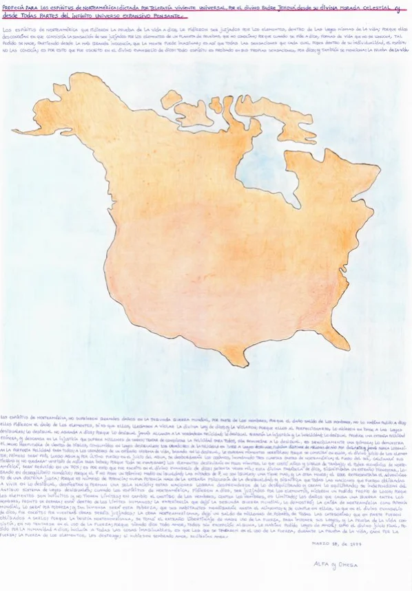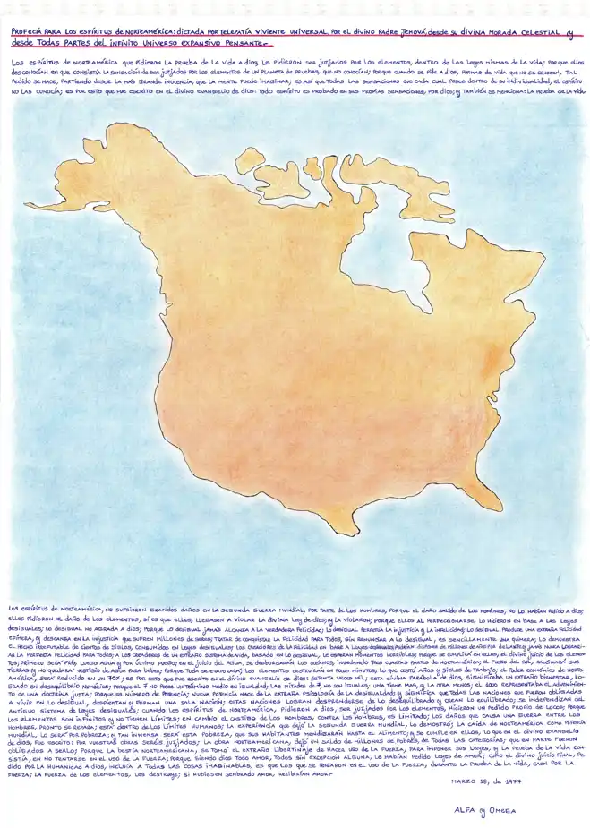 TÍTULO: PROFECÍA PARA LOS ESPÍRITUS DE NORTEAMÉRICA: DICTADA POR TELEPATÍA VIVIENTE UNIVERSAL, POR EL DIVINO PADRE JEHOVÁ, DESDE SU DIVINA MORADA CELESTIAL Y DESDE TODAS PARTES DEL INFINITO COSMOS; TRASCRIPCIÓN DE LA COLOSAL ESCRITURA TELEPÁTICA, REALIZADA DE PUÑO Y LETRA POR EL DIVINO PADRE SOLAR ALFA Y OMEGA (JESUCRISTO) QUIEN RETORNA UNA VEZ MÁS COMO EL HIJO DEL HOMBRE; BRILLANTE COMO UN SOL DE INFINITA SABIDURÍA, PARA TRAERNOS UNA NUEVA LUZ EN EL CONOCIMIENTO HUMANO.-