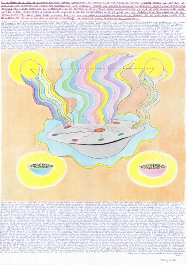 Así es hijo tal como lo piensas; el dibujo celeste enseña que de los mismos elementos salen las ideas físicas que cada cual generó en la prueba de la vida; es así que hasta los elementos acusarán a los que habiendo generado ideas, lo hicieron pensando en los armamentos; el llorar y crujír de dientes que tendrán los que pensaron en armas, será inmenso; porque los elementos les negarán su concurso como tales, a todos los que se tentaron en el extraño libertinaje de valerse de las armas y que en el divino juicio de dios, pidan ser resucitados a niños ó niñas de doce años de edad; porque es más fácil que le sea resucitada su carne, uno que al generar idas, lo hizo pensando en el amor; a que sea resucitado uno que en sus pensamientos, se dejó influenciar por sensaciones de armas; los que se dejaron influenciar por las llamadas armas de fuego, recibirán fuego eterno; los que se dejaron influenciar por leyes de amor, recibirán amor; el amor es del Reino de los Cielos; las armas son de la bestia; y la bestia dió la contra a lo del Reino de los Cielos, durante su prueba de vida; los que se perfeccionaron en el uso de la armas, serán llamados cómplices de la bestia en el llorar y crujir de dientes; y ninguno de los que fueron cómplices de los que siempre le dieron la contra a dios, ninguno volverá a entrar al Reino de los Cielos; el darle la contra a dios, consiste en preferir el uso de la fuerza, antes que el uso del amor; la caída de los individuos que pertenecieron a las llamadas fuerzas armadas, durante el reinado de la bestia, se debió a que se durmieron; la bestia los ilusionó y les creó una extraña indiferencia hacia la humildad en los hábitos de los pueblos; las llamadas fuerzas armadas, sólo sirvieron a un minúsculo grupo de acomplejados al oro; porque mientras exsistió el llamado capitalismo, exsistió también el primitivismo llamado fuerza armada; todas las filosofías de la luz, son del Reino de los Cielos; la fuerza no lo es; y los sistemas de vidas interesados tampoco son del Reino de los Cielos; esto constituye el dormir de la humanidad; los seres humanos no se dieron cuenta a medida que pasaban los segundos de vida, que en ellos mismos iba cumulándose un extraño desvirtuamiento; y el divino juicio llegaría en un instante dado en que ellos serían sorprendidos viviendo este desvirtuamiento; la criatura humana es tomada por sorpresa en medio de su propia psicología que le dió la bestia; se produce el choque emocional entre lo que se creyó que era lo normal en el propio pensar, y la divina psicología traída por el hijo de dios; esta divina psicología es la misma que todos pidieron en el Reino de los Cielos; es la misma que está en el divino evangelio de dios; lo traído de arriba es igual a lo que estaba escrito abajo; el dormir momentáneo de la humanidad, fué provocado por las extrañas costumbres de la bestia; lo efímero será despertado por lo eterno; la importancia a lo efímero trae siempre llorar y crujír de dientes, en los planetas de pruebas; es más fácil que en sus futuras exsistencias tenga a la eternidad de su parte, uno que en sus sensaciones, no le dió importancia a lo efímero; uno que no se puso límite alguno; a que la tenga, uno que cayó en extraño límite; la prueba de la vida consistía en comprender lo de dios; en comprender lo que no tenía ni principio ni fín; porque todo límite hacia dios, será considerado como una negación y una falta de fé, hacia el infinito de dios; quien empequeñece a dios, se empequeñece así mismo; porque los empequeñecedores siempre tendrán exsistencias pequeñas; esta ley dura mientras dure en ellos, la extraña soberbia de empequeñecer a dios; todo lo mental realizado en la prueba de la vida, que se dejó influenciar por límite alguno, tal límite recae en la misma criatura; es así que los que escogieron la carrera de las armas, en la prueba de la vida, tendrán por destino, ya nó los planetas de la luz; tendrán por destino, lo mismo que ellos prefirieron en la vida; tendrán por destino planetas de las tinieblas; en donde jamás encontrarán ni la paz ni el amor; los influenciados por las armas, escogieron mal; porque el uso de la fuerza, no conduce a dios; ningún llamado uniformado perteneciente a las llamadas fuerzas armadas de la bestia, ninguno volverá a conocer, algún mundo de la luz; ellos perdieron una oportunidad más, en la prueba de la vida; el camino que cada cual escogió en la prueba de la vida, es el equivalente a su propio cielo; cada vida representa un cielo con sus propias características; como las llamadas fuerzas armadas no pertenecen al Reino de dios, es que todo uniformado no tiene herencia en dios; es más fácil que tenga herencia, uno que cumplió las leyes de amor de dios; a que tenga herencia, uno que escogió el libertinaje de hacer uso de la fuerza, y no haberla pedido a dios; porque ninguna forma de atropello se pide a dios; es cosa sabida en el Reino de los Cielos, de que el Eterno es infinitamente amoroso; es decir, que es una insolencia, el pedir a dios, sensaciones de atropello, como lo son los que escogieron el extraño camino de las armas, en la prueba de la vida; los que pertenecieron a las legiones de satanás, fueron traidores a dios; ellos le prometieron cumplir con las leyes de la luz; y la luz de dios, excluye toda forma del uso de la fuerza; hacer lo contrario a lo prometido, será considerado traición, en el divino juicio de dios; es lo que quiso decir la divina parábola- advertencia: No se puede servir a dos señores; porque en el Reino de los Cielos, se prometió servir sólo a uno; el que no lo comprendió así en la prueba de la vida, perdió en la prueba; es lo que les sucedió a todos los individuos pertenecientes a las llamadas fuerzas armadas, surgidas durante el extraño reinado de la bestia.-