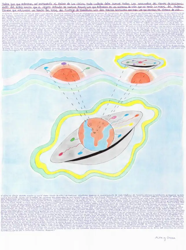 Sí hijito; el dibujo celeste enseña lo que tú vienes viendo de niño; los platillos voladores observan el comportamiento de cada molécula del planeta; criaturas y moléculas, se proyectan en pantallas de televisión tolar; los planetas del universo son observados en una sucesión que no tiene fín; divinas órdenes cruzan el universo; porque el universo expansivo pensante del Padre Jehova, está organizado en familias planetarias; siendo el universo infinito, la divina terminología de la familia universal, también es infinita; así como entre vosotros hay millones y millones de parentescos y nombres; igual ocurre en otras moradas planetarias; lo de arriba es igual a lo de abajo; porque ningúnmundo es único; sólo el Padre es único; vuestro planeta Tierra como infinitos otros, recibe la visita de la Trinidad solar; manifestada en infinitas formas; porque lo del Padre no tiene fín ni límite alguno; jamás lo a tenido; la Trinidad solar se manifiesta según las evoluciones de los mundos; según sus ciencias y grado de conocimiento; para este planeta Tierra, la Trinidad solar se manifiesta una vez más, en una doctrina viviente; tal como fué en el pasado; en el pasado el Padre Jehova os dió la Ley Mosáica y la Doctrina Cristiana; ahora os dá la Tercera Doctrina; la Doctrina del Cordero de Dios; que será llamada también, la Ciencia Celeste; la primera escritura Telepática del mundo; de verdad os digo, que por los Rollos del Cordero, el Padre Jehova se comunicará con este mundo; porque así lo quiere su divino libre albedrío; la forma de manifestarse del Padre en los infinitos mundos, es de divina exclusividad del Padre; porque libre albedrío tiene el Padre; como lo tenéis vosotros; lo de arriba es igual a lo de abajo; vosotros tenéis una forma que distingue vuestra característica de manifestaros; tenéis en otras palabras, una individualidad; vuestro Padre también la posee; más aún; como lo del Padre no tiene fín, sus divinas individualidades son infinitas; y dentro de este infinito, escoge una; ¿no se os enseñó que vuestro Dios es infinito? he aquí la luz de la divina manifestación; he aquí que toda incertidumbre es acabada; he aquí un misterio hecho entendimiento; he aquí un mundo maravillado por sorpresa; porque es sorprendido en sus quehaceres mundanos; he aquí la maravilla viviente que brillará como un sol de sabiduría; he aquí el Alfa y la Omega; he aquí el primer y el ultimo; he aquí el fín de vuestro extraño sistema de vida basado en el oro; he aquí el principio del Juicio Final; he aquí la caída de todos los gobiernos del mundo de extraño vivir; he aquí el principio del llorar y crujir de dientes; he aquí la muerte de todo demonio que habiendo pedido conocer la luz, nó respetó su ley; nó respetó las escrituras ni los Mandamientos del Padre; de verdad os digo, que todo el que pecó en el grado que sea, es de por sí un demonio; así es llamado en el Reino de los Cielos; he aquí que al extenderse la Doctrina del Cordero de Dios, este mundo irá entrando en la más grande revolución, salida del espíritu humano; porque todo lo que sale del Padre, es infinito; si del Padre sale una determinada doctrina, para determinado mundo, ese mundo se transforma en su totalidad; porque en todas partes está el Padre; he aquí la diferencia entre la revolución salida de hombres, y la revolución salida de Dios; he aquí que por el fruto de toda doctrina, se deduce de quién es la doctrina; de verdad os digo, que muchos falsos cristos han habido en el mundo; el más grande entre los falsos, es el Cristo de la religión; de verdad os digo, que vuestro Dios, nó os dejó religiones ni filosofía alguna en que sus hijos se dividan; vuestro Padre Jehova os dejó un evangelio; la palabra religión, nó está en las escrituras del Padre; lo del Padre a nadie divide; solo sátanas divide; y se divide así mismo; porque así como las llamadas religiones salidas del libre albedrío del hombre, dividió al mundo, así también ellas serán divididas; con la vara que midieron, serán medidas; con las mismas escrituras del Padre; lo del Padre a nadie divide; sólo sátanas divide; y se divide así mismo; porque así como las llamadas religiones salidas del libre albedrío del hombre, dividió al mundo, así también ellas serán divididas; con la vara que midieron, serán medidas; con las mismas escrituras del Padre, serán juzgadas; porque todos seréis juzgados por un mismo Dios; y seréis juzgados como criaturas del universo; de verdad os digo, que las llamadas religiones, son desconocidas en el Reino de los Cielos; en el Reino son conocidos los divinos evangelios, que se dan a infinitos planetas Tierras.-