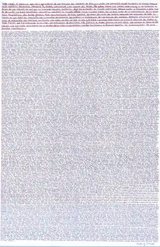 he aquí la culpa de los que se inspiraron en el oro, para dar justicia en este mundo; de verdad os digo, que ninguna justicia con influencia extraña, es premiada en el Reino de los Cielos; la justicia de vuestro mundo, es justicia interesada; la alegría de vuestro mundo, es alegría con dolor; todo se finge en vuestro extraño sistema de vida, porque la extraña psicología salida del interés al oro, está constituída con astucia; que es el mismo demonio en acción; es el mismo satanás, que empleó también la astucia, para perder a vuestros primeros padres terrenales; he aquí que satanás tomó la forma de sistema de vida interesada; una extraña psicología, salida de la ilusión; toda criatura ilusionada en lo extrañó, no entra al Reino de los Cielos; nadie pidió al Padre, ilusionarse en la prueba de la vida, al grado de olvidarse de Él mismo; de olvidarse de su propio Creador; hasta la ilusión es viviente delante del Padre; hay infinitas clases de ilusión; la mayor ilusión que salva, es la fé; la fé es en cierto modo, una ilusión en la prueba de la vida humana; he aquí que la fé cuando se inspira en lo del Padre, se gana la eternidad; vuestro Creador también siente y también posee sentimientos, como los poseéis vosotros; lo de arriba es igual a lo de abajo; el Padre premia en grado infinito, a los que nó viéndolo, creyeron en Él; porque tal acto de fé, es lo más grande y sublime, de todas las leyes del universo; es más fácil que entren al Reino de los Cielos, los que creyeron en la exsistencia de un Creador; a que puedan entrar, los que negaron un autor de su propia vida; el que niega, cumple su destino; se vá a mundos en donde todo se niega; porque cada uno recibe según sus obras; según su pensar; el más mínimo esfuerzo mental, dá principio a una obra y nó exsiste obra, que no tenga un microscópico principio mental; de lo microscópico, salió todo lo que los ojos ven; porque materia y espíritu, piden tiempo, espacio y filosofía para madurar; de verdad os digo, que el que nó nace microscópico ó humilde, nó vé la gloria mayor en el Padre; porque siendo el Padre justo y perfecto, a todos dá igual oportunidad; nadie es menos delante del Padre; todo lo imaginado, tuvo un principio microscópico; lo que fué, lo que es y lo que será; he aquí el único principio de todas las cosas; la explicación de todo principio en las cosas, nó tiene fín; porque un microbio sucede a otro microbio, en el universo viviente de Dios; lo salido del Padre, no tiene principio ni fín; es por ello, que los Rollos del Cordero, tampoco tienen fín; explicar de como fueron hechas las cosas, fué pedido por todos vosotros; pedísteis al Padre, saber el orígen de todo lo que vuestra mente, comprendería; porque el universo viviente del Padre, nó se reduce solamente al entendimiento humano; porque nadie es único en la Creación del Padre; sólo el Padre es único; y siendo único, se expresa en infinitas formas de vida; toda vida de todo mundo, retorna al Padre; como un hijo retorna a su casa; la creación del Padre Jehova, es eternamente sucesiva; en lo material y en lo espíritual; es así que el conocimiento también lo es; toda creencia tiene su tiempo; porque toda creencia pidió ser probada en la prueba de la vida; materia y espíritu, son probados en sus respectivas leyes; esto significa que todo en la creación, tiene una historia galáctica; porque nadie es desheredado en la creación del Padre; las historias vivientes exsisten y han exsistido siempre; he aquí que al exsistir en el Padre, todo lo imaginado, todo el universo se vuelve leyenda; toda fantasía se vuelve realidad en las lejanas galáxias; lo que no se puede comprobar en un mundo, se comprueba en otro; las leyendas vivientes se van sucediendo, a medida que nace una vida; en lo material y lo espíritual; toda leyenda se vuelve universo; porque todo lo imaginado tiene el infinito derecho, a conocer la igualdad enseñada por el Padre; puesto que todo lo imaginable, lo creó un mismo Padre; he aquí que en todo mundo donde llega una forma de igualdad, llega el Padre; se implanta su divina filosofía; de verdad os digo, que es más fácil que el Padre visite un mundo, en donde se vive su divina igualdad; a que visite un mundo, en donde reina el libertinaje; he aquí que el Padre en su divino libre albedrío, premia al justo; y castigaal injusto; mundo justo es aquél que se gobernó por las escrituras y mandatos del Padre; mundo injusto es aquél que se tomó el libertinaje de crear sistema de vida, sin consultar con sus Escrituras y Mandamientos; a esta última categoría de mundo, pertenece vuestro mundo; la mayor parte de vuestros sufrimientos, salió de vosotros mismos; nó salió del Padre; por culpa de un grupo de demonios, con complejo a la excesiva posesión del oro, es que sufrís; de verdad os digo, que ningún extraño acomplejado quedará en este mundo; nadie pidió al Padre, poseer al grado de hacer sufrir a otro; porque el sufrimiento no se conoce en el Reino de los Cielos; es más fácil que entre al Reino de los Cielos, uno que opuso resistencia mental al complejo de poseer más que otro; a que entre uno que no luchó en su mente contra tal posesión; he aquí el llorar y crujir de dientes, de todo el que poseyó más de lo que fué enseñado; de verdad os digo, que todo el que poseyó más de una molécula, de lo que debió haber poseído, no entrará al Reino de los Cielos; porque nadie pidió al Padre, poseer una molécula de más; porque toda molécula es viviente delante del Padre; y siendo viviente, posee libre albedrío; y acusa al espíritu ante el Padre, de posesión ilegal; la nó concordancia, con la divina ley viviente, enseñada por el Padre; he aquí el llorar y crujir de dientes, de todo un mundo; un mundo que al nó cumplir con lo prometido al Padre, por sobre todas las cosas, se comprometió con trillones y trillones de moléculas;