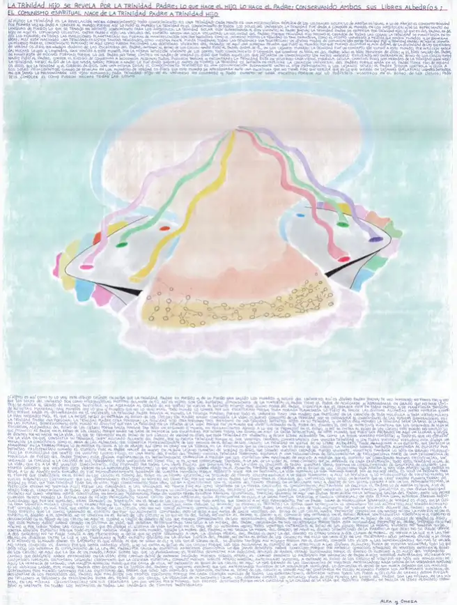 Sí hijito; es así como tú lo ves; este dibujo celeste enseña que la Trinidad Padre es fuego; y de su fuego han salido los mundos y soles del universo; así es divino Padre Jehova; te veo inmenso; no tienes fin; y veo que los soles del universo son como microscópicas motitas delante de tí; así es hijito; son las infinitas dimensiones de la materia; el Padre tiene el poder de achicarse y agrandarse en grado que no tiene límites; se achica al grado de hacerse invisible y se agranda al grado de no verse; se vuelve el infinito mismo; este divino poder del Padre, significa que el Creador está en todas partes; y se manifiesta también de infinitas maneras; hay mundos que lo ven y mundos que no lo ven; más, todo mundo lo conoce por sus escrituras; porque toda morada planetaria lo pidió al hacer las divinas alianzas entre materia y espíritu; porque nadie es desheredado en el universo; la Trinidad Padre revela al mundo, la Trinidad Madre; porque todo el universo tuvo una madre; que participó en la creación de toda molécula y toda virtud; muchos la han negado; más, el que la negó, negó su entrada al Reino de los Cielos; sin madre nadie conocería la vida; el nuevo concepto de la Trinidad que se extenderá al conocimiento de las futuras generaciones es: La Trinidad Padre una persona; la Trinidad Madre otra persona; la Trinidad hijo otra persona; tres personas en una Trinidad; infinitos hijos en su Trinidad, y un sólo Dios nomás; la Trinidad será la base de la moral en las futuras generaciones; este mundo ni discutió qué era la Trinidad en la prueba de la vida; porque fué un mundo que vivió ilusionado en el poder del dinero; el oro le entretuvo, mientras que los segundos de vida se escurrían, alejándolo del Reino de los Cielos; porque basta pensar tan sólo un segundo ó menos, en pensamientos ajenos a lo que se prometió en el Reino, y nó se entra al Reino de los Cielos; este mundo no cumplió lo que prometió al Padre en el Reino de los Cielos; porque nadie se sabe de memoria sus escrituras por sobre todas las cosas; he aquí la caída intelectual de este mundo, que pidió ser probado; he aquí un llorar y crujir de dientes por no hacer en la vida, lo que se prometió en el Reino de los Cielos; de verdad os digo, que toda Trinidad es viviente; y posee libre albedrío tal como la posee vuestro espíritu; y todo el que no estudió en la vida en qué consistía su Trinidad, será acusado delante del Padre, por su propia Trinidad; porque al ser vosotros creados, conversásteis con vuestra Trinidad y con todas vuestras virtudes; esta divina conversación la conocísteis como el arca de las alianzas; que significa materialización de los hechos en el Reino de los Cielos; la Trinidad en virtud de su libre albedrío, puede abandonar a un espíritu, que también le abandonó en la Tierra; porque lo de arriba es igual a lo de abajo; así como se obró en la Tierra, es la respuesta que se encuentra en el Reino de los Cielos; la Trinidad siendo infinita acompaña al espíritu por infinitas exsistencias; cuando el espíritu pide al Padre nacer de nuevo en algún lejano planeta; de verdad os digo, que siendo vuestro Creador fuego viviente, vosotros también lo sóis en grado microscópico; la electricidad que sentís en vuestro cuerpo físico, es una parte del fuego del Padre; vuestra trinidad terrenal equivale a una trillonésima de trillonésima de trilIonésima parte de una trillonésima de molécula de fuego del Padre Jehova; esta divina equivalencia es infinitamente expansiva a medida que los espíritus van naciendo de nuevo; a medida que el espíritu vá conociendo nuevas exsistencias, vá variando la cualidad y la calidad de sus trinidades; esta variación no tiene fín; y es lo que corresponde también, a la sal de la vida; al conocimiento que se aprende en cada exsistencia; todo esto, trinidad y sal de la vida, que es a la vez vuestro conocimiento, está formado por todas las ideas físicas que generásteis en la vida; el conjunto de todas vuestras ideas, forman un conglomerado de galáxias de colores; los mismos colores que vuestros ojos vieron en la naturaleza terrestre; lo que vuestros ojos vieron abajo en el planeta, también se ven arriba, en el Reino de los Cielos; hay vida arriba y hay vida abajo; lo de arriba es igual a lo de abajo; esta realidad os fué momentáneamente borrada de vuestra memoria; porque pedísteis vivir por un instante, la vida humana; la vida humana aunque sea de muchos años, es solo un instante para el tiempo que conocísteis en el Reino de los Cielos; el tiempo del Reino es un tiempo celestial; un segundo de tiempo celeste equivale a un siglo terrestre; y allí lo invisible y lo microscópico de vuestro mundo, se vuelve gigantesco; ciertamente que las dimensiones exsisten; su número no tiene fín; porque nada en el Padre lo tiene; para el Creador del universo, hace sólo un instante que se creó vuestro planeta Tierra;